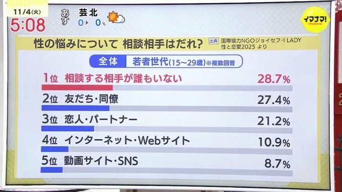 国際協力NGOジョイセフが15歳から29歳の若者を対象に行った、「性などに関する意識調査」。性の悩みについて相談相手は誰という質問に、「相談する相手が誰もいない」と答えた人が最も多くなっています。インターネットやSNSが相談相手という回答もあります。そんな中、10代や20代の若者が体や心、性の悩みを気軽に専門家に相談できる場所が、スウェーデン発祥の無料相談所「ユースクリニック」です。