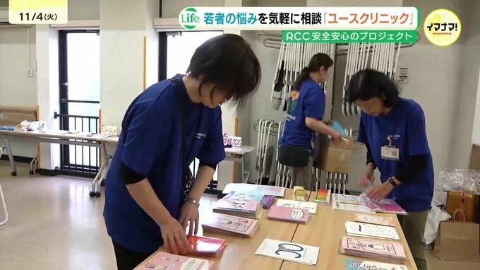 10月、広島市内で開かれた「ひろしまユースクリニック」。室内には、性教育の本や月経前症候群(PMS)に関するパンフレットのほか、生理用品のサンプルなどが並べられています。