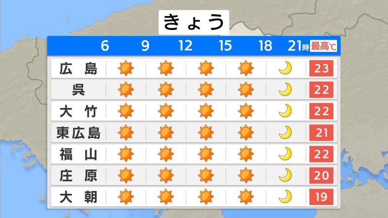 けさ(7日朝)の広島県内は、引き続き晴天で各地で雲が少なくなっています。放射冷却の影響で、北部や内陸部では霧が出ている所があります。北部には濃霧注意報が発表されていますので、昼前にかけて車の運転など注意が必要です。最低気温は、広島市中区で11.1℃ 大朝1.9℃ 油木1.3℃など、きのうよりやや低くなっています。