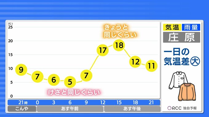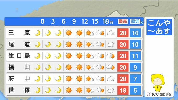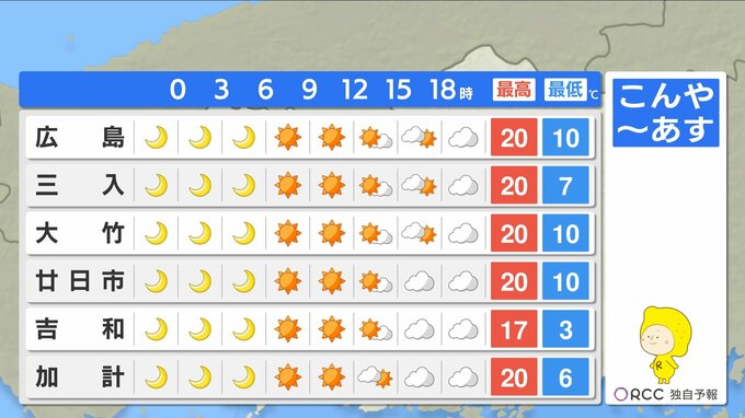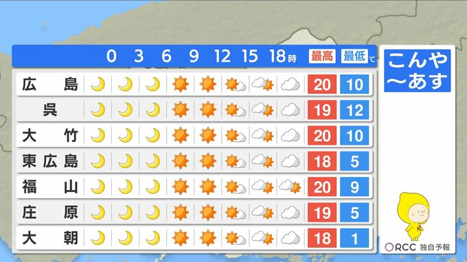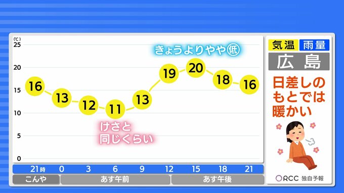 朝の気温は、けさと同じくらいでこの時期らしい気温でしょう。日中は、20℃前後まで上がり、日差しの元では暖かさも感じられそうです。