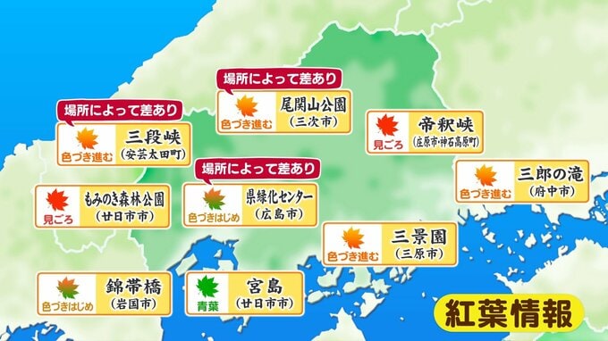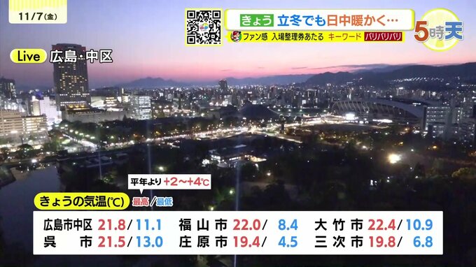 きょう7日(金)は「立冬」でしたが、広島県内はよく日差しが届き、小春日和となりました。最高気温は、大竹市で22.4℃、広島市中区で21.8℃、三次市で19.8℃でした。