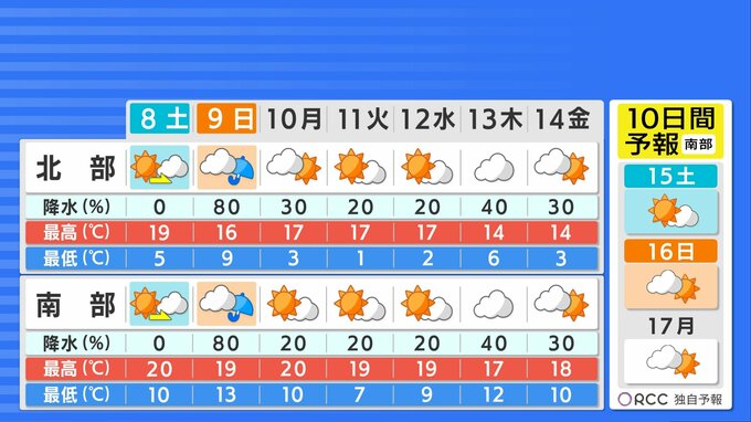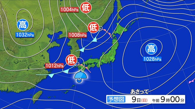 あさって9日(日)は、前線上に低気圧が発生し、県内に近付く予想です。早い段階から雨が降り始め、夕方まで断続的に降るでしょう。放射冷却が効きにくく朝の冷え込みは、緩む見込みです。