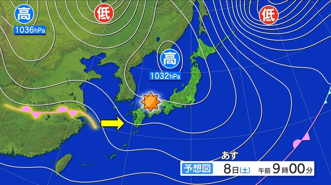 あす8日(土)は、高気圧に覆われて日中はよく晴れますが、西からは前線が近付いてきます。夕方から雲が多くなりますが、あすいっぱい大きな崩れはない見込みです。