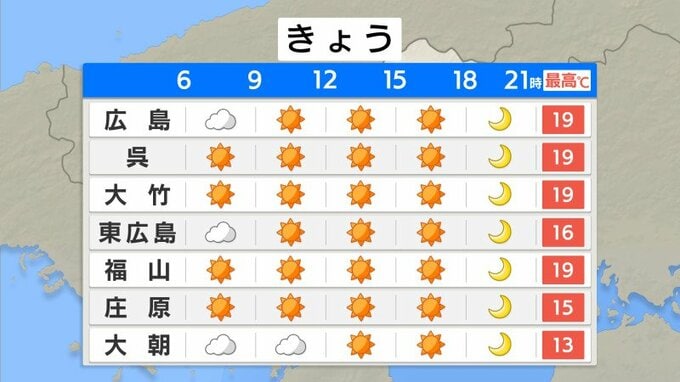 けさ(10日朝)の広島県内は、北部を除いて雲が少なくなっています。最低気温は、広島市中区で13.8℃・庄原市8.0℃・神石高原町6.2℃などでした。氷点下の地点はありませんでした。