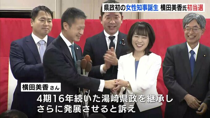 前副知事の横田さんは、4期16年続いた湯崎県政を継承し、さらに発展させると訴えました。自民、立憲、国民、公明の各党から推薦を得て、与野党相乗り候補として組織戦を展開し、初めての当選を果たしました。