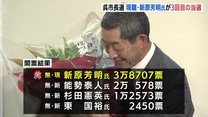 呉市長選 現職の新原芳明氏が3回目の当選果たす 県議会安佐北区補選は新人の水口氏 9日投開票 2025年11月10日(月) 12:03 国内 任期満了に伴う呉市長選は9日、無所属で現職の新原芳明氏が3回目の当選を果たしました。新原氏は、呉市出身の75歳。自民、立憲、国民、公明から推薦を受けました。選挙戦では、防衛省による日本製鉄跡地への複合防…