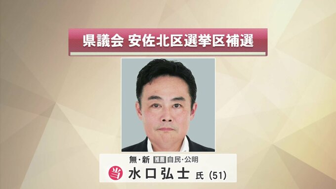 また、大規模買収事件をめぐる県議会議員の辞職に伴う県議会安佐北区選挙区の補欠選挙は、無所属新人で自民、公明が推薦する会社顧問の水口弘士氏が初当選しました。