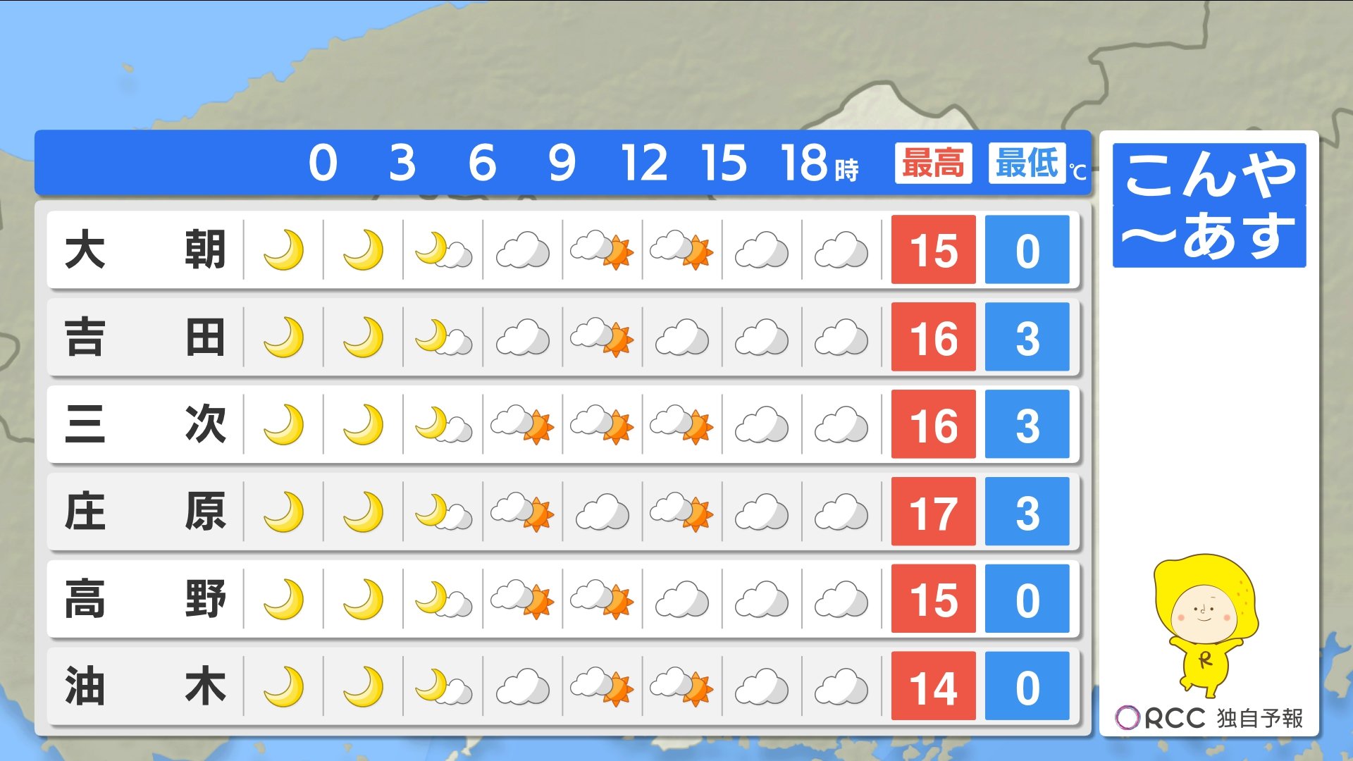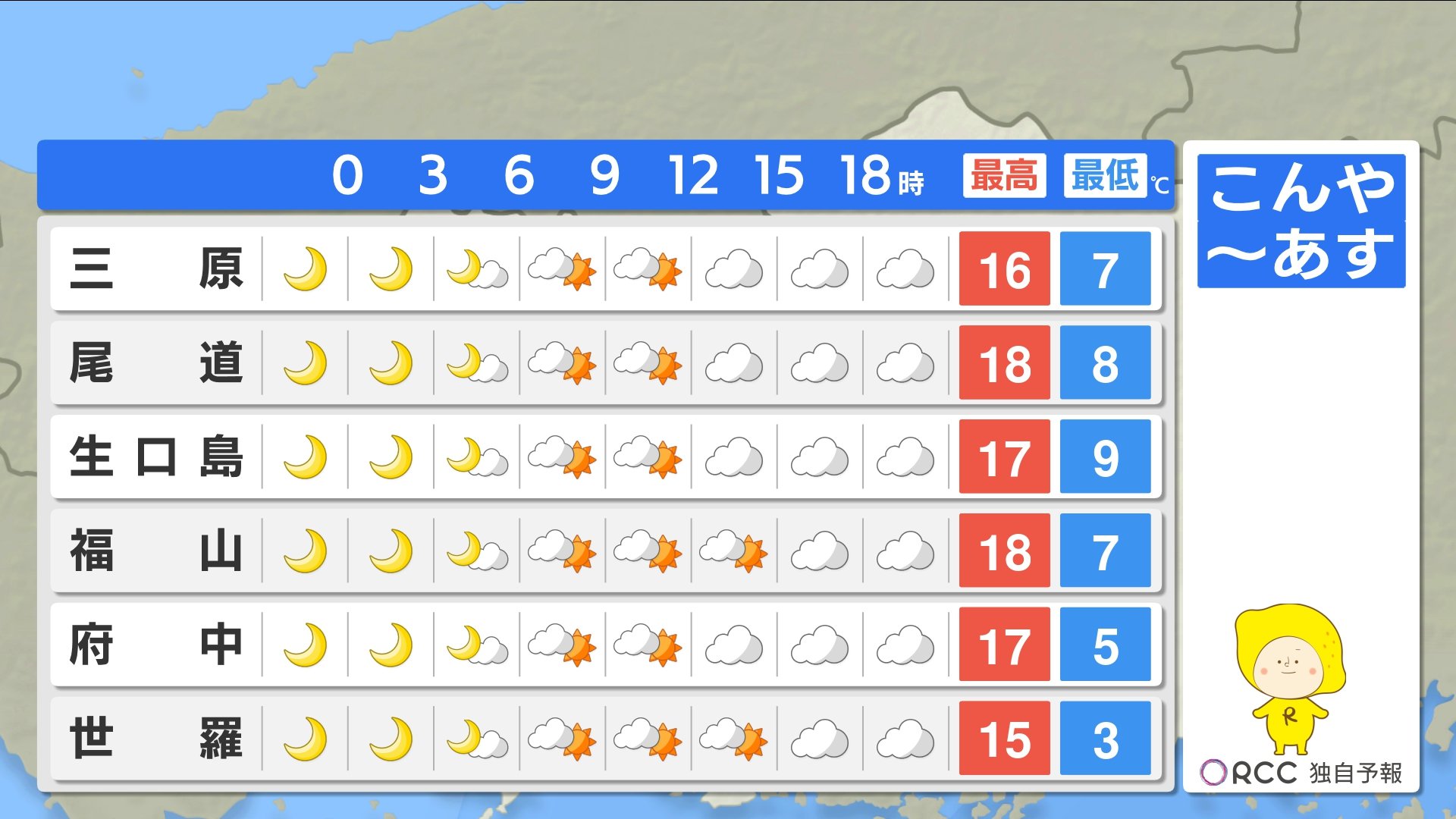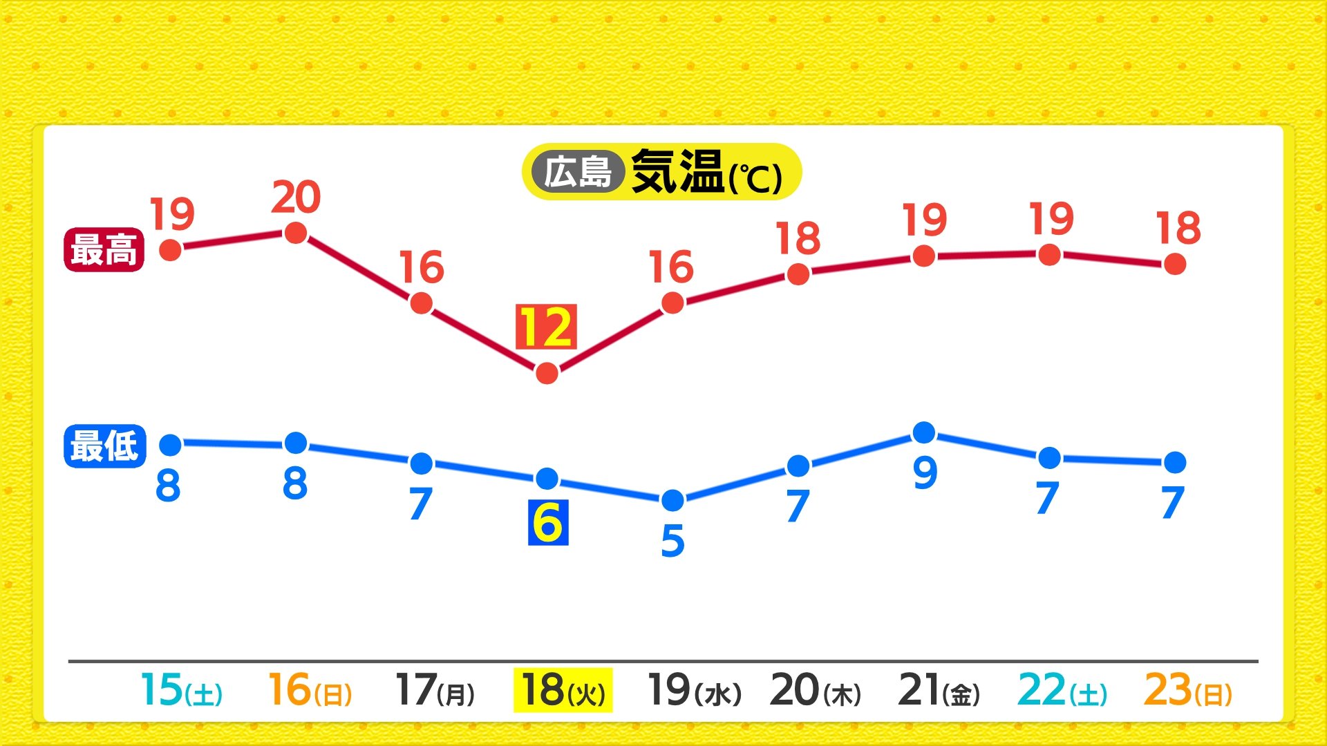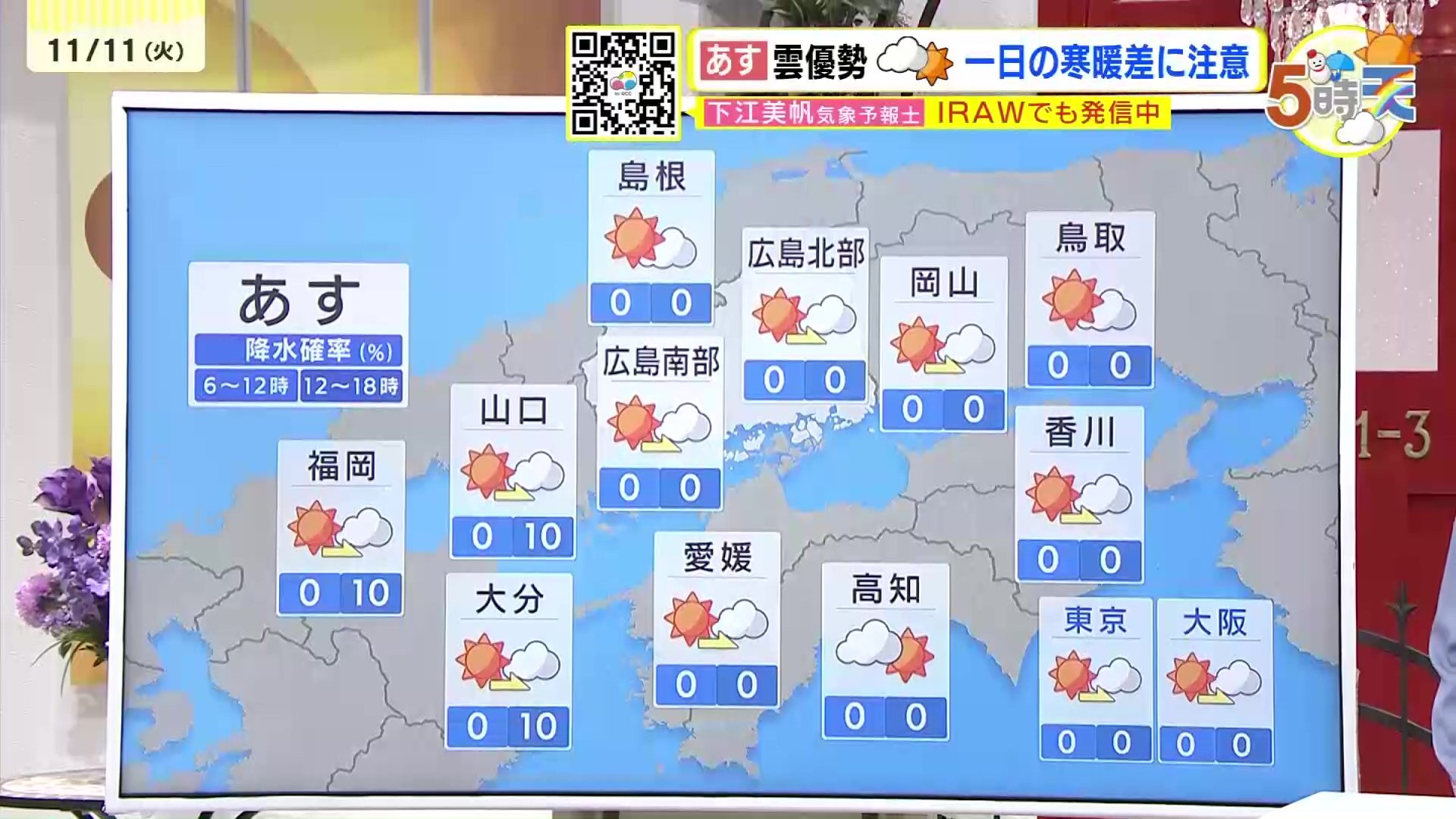 きょう11日(火)の広島県内は、朝から晴れたり曇ったりでしたが、午後はすっきりと晴れました。朝の冷え込みが強まり、きょうは県内14地点で今季一番の冷え込みになりました。日中はおおむね平年並の地点が多く、一日の寒暖差が大きくなりました。