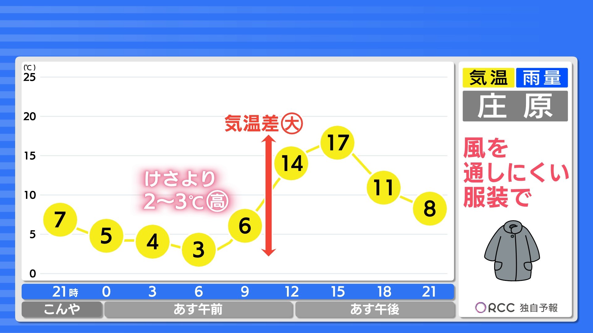 あす朝の気温は、けさよりもやや高くなりますが、引き続き冷え込みが厳しいため、今晩も暖かくしてお休みください。最高気温は、きょうと同じくらいからやや高くなり、この時期らしい気温になるでしょう。引き続き一日の寒暖差が大きいですので、脱ぎ着しやすい服装でお過ごしください。