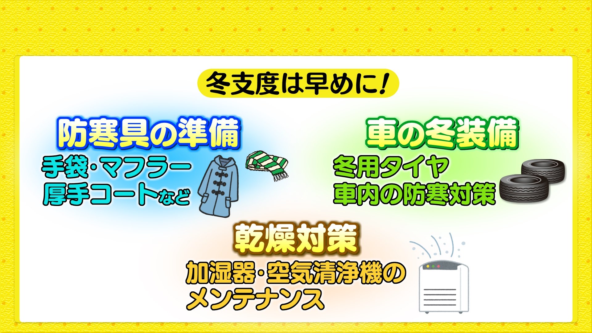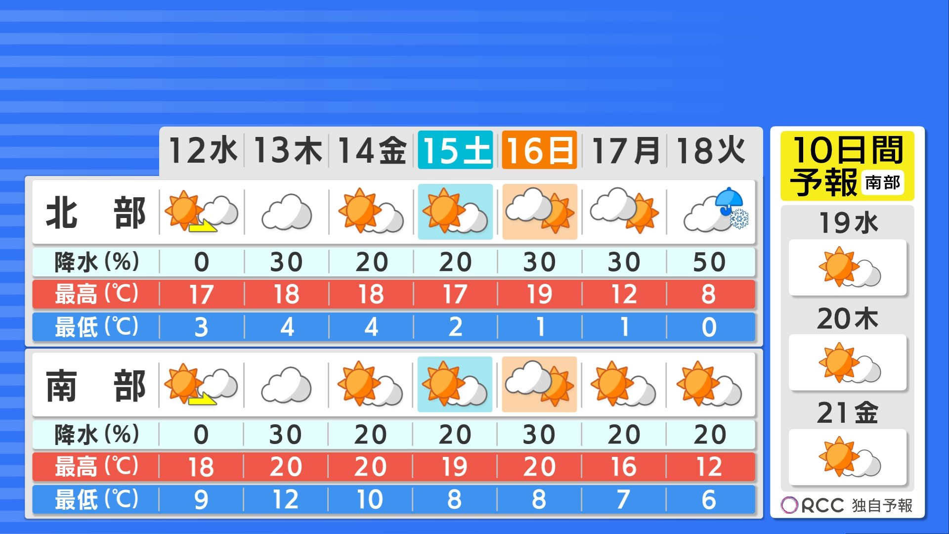 この先もおおむね晴れる日が多いですが、あさっては雲が広がりやすく、沿岸部中心に南から湿った空気が流れ込みやすく、にわか雨の地点があるでしょう。冬支度をはやめに進めた方が良さそうです。今週は一日の寒暖差に注意が必要ですが、来週前半は日中の気温が大幅に下がり、12月中旬並になる予想です。山地を中心に雪が舞ったり雪化粧する可能性があります。冬用タイヤの準備や防寒具の準備など、本格的な冬支度を進めた方が良いでしょう。