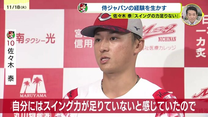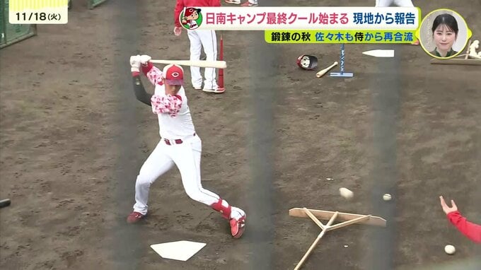 侍ジャパンの一員として韓国戦に出場した佐々木泰がカープの秋季日南キャンプに再合流しました。