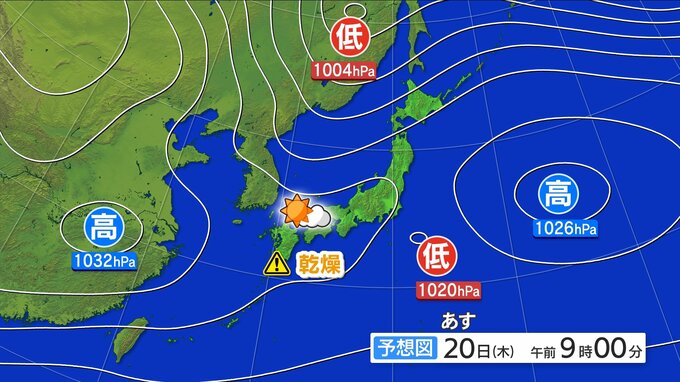 20日(木)冬型緩む 広く晴天 空気の乾燥に注意 各地で今季一番寒い朝になる見込み