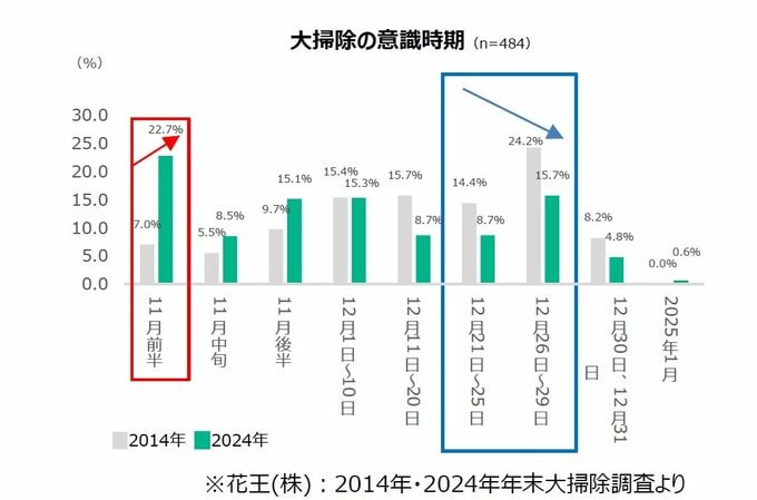 メーカーの花王が年末の大掃除に関する調査を実施したところ、この10年で大掃除を“11月前半から意識する人”がプラス15.7%と大幅に増加していました。その結果、実際の大掃除開始時期も前倒しされ、秋から徐々に取り組む“大掃除の早期化”の傾向が強まっています。