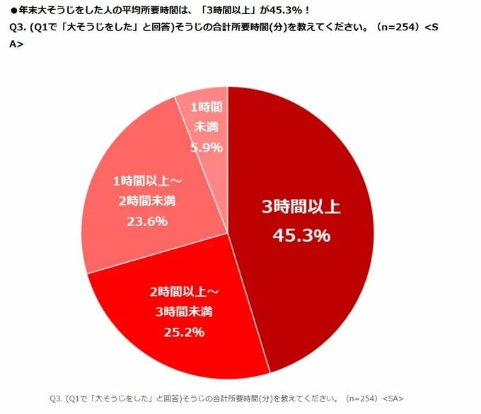 また、大掃除にかける時間は「3時間以上」という人が最も多いという結果も出ています。年末は旅行や帰省で家を空ける人も多く、そもそも掃除をする時間を確保できない――それが大きな理由と言えそうです。