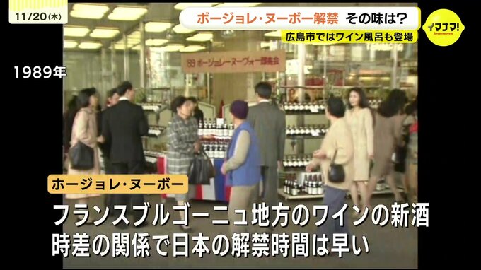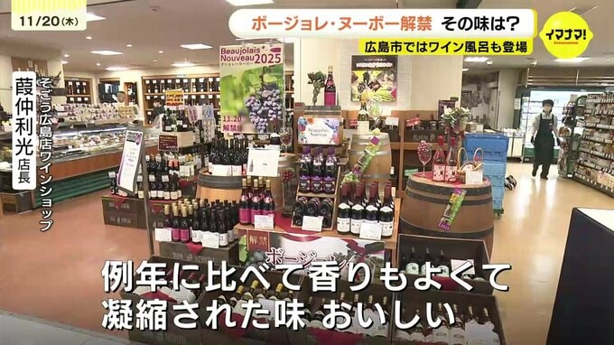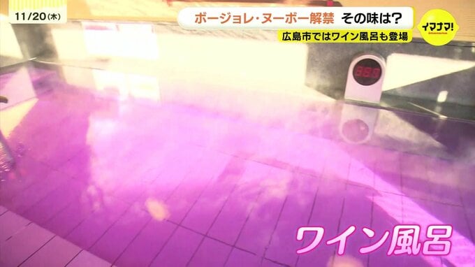 ワインの新酒「ボージョレ・ヌーボー」がきょう午前0時に解禁され販売が始まりました。広島市ではワイン風呂も登場しました。