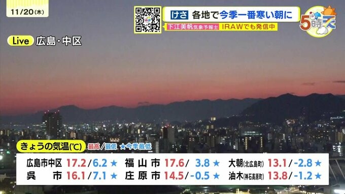 きょう20日(木)の広島県内は、14地点で今シーズン最も低い最低気温となり、今季一番寒い朝となりました。中でも、大朝で-2.8℃ 油木で-1.2℃など、5地点で最低気温が0℃を下回り、冬日となりました。