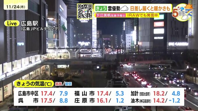 きょう24日(月)の広島県内は、日差しのもとでは暖かかったですが、雲が広がりやすい一日で、にわか雨の地点もありました。ことし最後の3連休最終日でしたが、お出かけ日和になりましたね。日中の気温は、加計で18.2℃ 広島市中区で17.4℃まで上がり、日差しのぬくもりを感じられました。