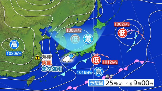 25日(火)大気の状態非常に不安定 落雷・突風・強雨に注意 黄砂の飛来も 視程悪化に注意