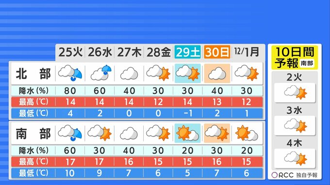 気温はおおむね平年並の日が続き、日差しが届くとぬくもりを感じられるでしょう。引き続き朝晩の冷え込みは厳しいですので、寒暖差で体調を崩さないようご注意ください。