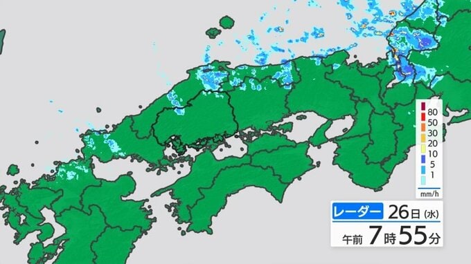きょう26日(水)の広島県内は、山沿い中心に雨が降っているところがあります。北部ほど雲が広がり、気温が下がりにくい朝となりました。最低気温は、広島7.9℃、三次6.3℃、平年より4℃くらい高かったところもあります。