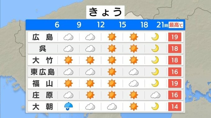 きのうからけさまで、上空にはこの時期としては強い寒気が入り、大気の状態が不安定となっていました。天気の急変が起こりやすく、県内でもひょうやあられが降ったところもありました。だんだんと寒気はゆるんできましたが、このあと午前中までは北部ほど雨が降りやすくなっています。各地日差しが届き、暖かさも感じられるでしょう。最高気温は、広島・福山19℃、呉18℃、庄原16℃の予想です。