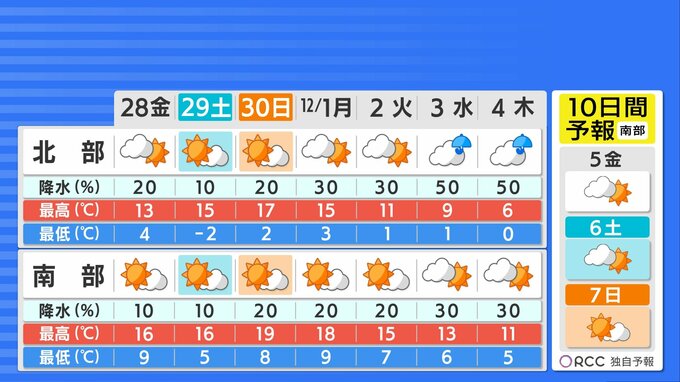来週火曜日頃にかけて、おおむね晴れの天気が続くでしょう。来週前半にかけて日中の気温は、平年並から平年より高い日が続くでしょう。引き続き朝晩の冷え込みは厳しいですので、一日の寒暖差にご注意ください。