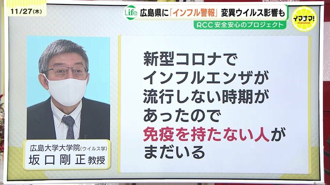 今シーズンの流行について、ウイルス学が専門の広島大学大学院・坂口剛正教授は「新型コロナでインフルエンザが流行しない時期があったので、免疫を持たない人がまだいること」
