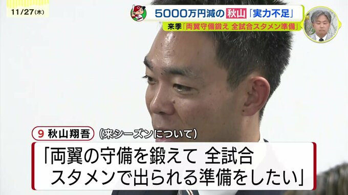 一方、来シーズンプロ16年目となる37歳の秋山翔吾は1億8000万円から5000万円減の1億3000万円プラス出来高でサインしました。