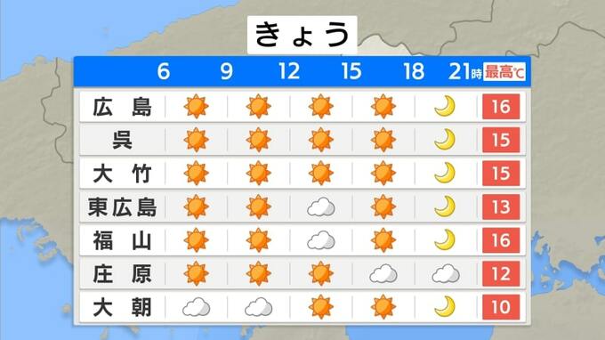 けさ(28日朝)の広島県内は、曇っている範囲が多くなっています。けさの冷え込みは弱く、呉で12.2℃ 広島市中区で11.7℃ 庄原6.4℃できのうと比べると4℃~5℃ほど高くなっています。