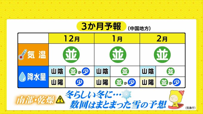 今シーズン(12月~2月)中国地方の天候はどうなるのでしょうか。気象庁が発表している最新の3か月予報によりますと、今シーズンの冬(12月~2月)の平均気温は、ほぼ平年並となっています。これまでの夏・秋の気温は記録的に高かったですが、12月以降は冬らしい冬がやってくる見込みです。