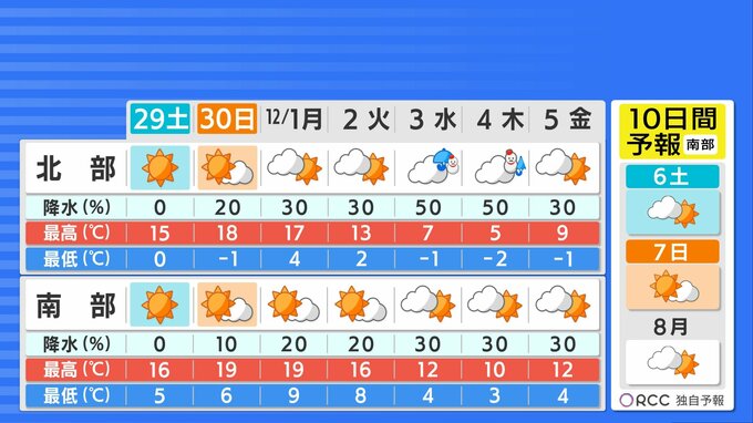 来週の火曜までは、晴れて日差しが暖かい日が多いでしょう。水曜以降は、上空に強い寒気が入る見込みです。北部では、雪やみぞれが降り、路面の凍結のおそれもあります。冬用タイヤへの交換など、冬支度がまだの方は、早めに進めておいた方が安心です。短い期間で気温変化が大きいので、体調管理にはご注意ください。