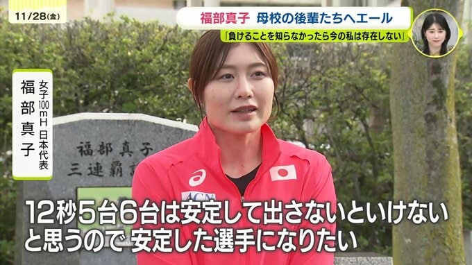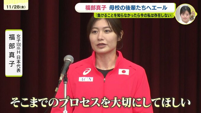 100メートルハードルの日本記録保持者で東京世界陸上では準決勝に進出した福部真子選手(日本建設工業)が母校を訪れ後輩たちにエールを送りました。母校の広島皆実高校でおよそ950人の生徒に迎えられた福部真子選手。9月に出場した東京世界陸上の報告会が行われました。後輩たちへ語るテーマは「世界で戦った経験」と「高校時代に培った力」です。