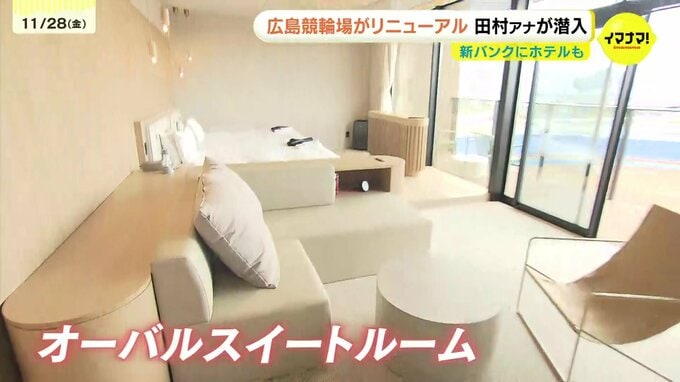 「スイートルームです。すごい、広々とした空間です。L字型のソファーにベッドが2つ。一番の魅力がベランダですよ。真正面にダンクを一望することができます」