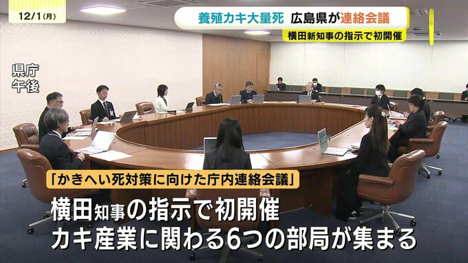 広島県内では9月以降、特産品である養殖カキが大量死する被害が出ています。横田新知事の指示で初めて開かれた連絡会議では、農林水産局のほか商工労働局などカキ産業に関わる6つの部局が集まって被害の確認などを行いました。