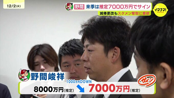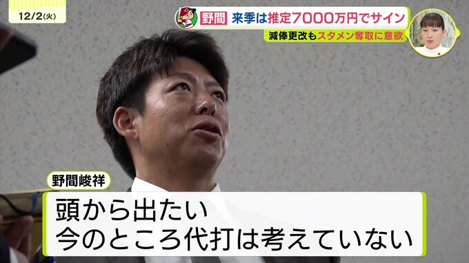 主に代打として起用された野間は8000万円から1000万円減の推定7000万円でサインしました。