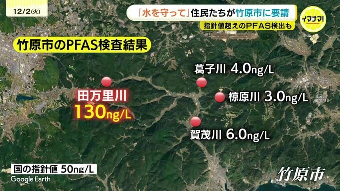 竹原市によりますと、賀茂川とその支流3カ所で水質検査をした結果、全てのポイントからPFASが検出されたということです。中でも田万里川からは130ng/Lと、国の指針値の2.5倍以上となっています。