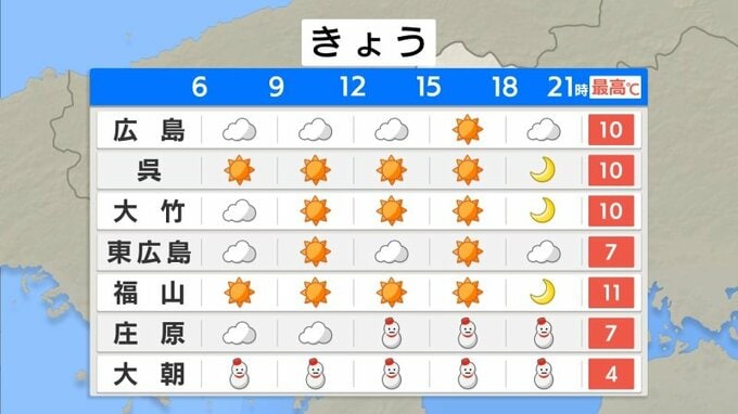 このあと、上空にはこの時期としては強い寒気が流れ込み、真冬の寒さとなる見込みです。北部では、昼ごろから雪がちらつき始め、今夜からあすの朝にかけて、雪が積もるところもあるでしょう。南部でも、標高が高いところでは路面が白くなるところがある見込みです。南部では乾燥した状態が続くでしょう。日差しが届いても気温は上がりにくく、予想最高気温は広島・呉10℃、福山11℃、庄原7℃。朝からあまり変わらない見込みです。また、あすの朝にかけて冷え込みが強まりますので、県内広い範囲で路面の凍結のおそれがあります。橋の上やトンネルの出入り口などでは、特にご注意ください。