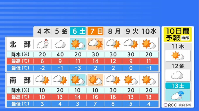 ただ、土曜日頃にかけて朝晩の冷え込みはかなり強く、北部や内陸部を中心に氷点下の冷え込みが続く見込みです。路面の凍結や水道管の凍結に十分ご注意ください。