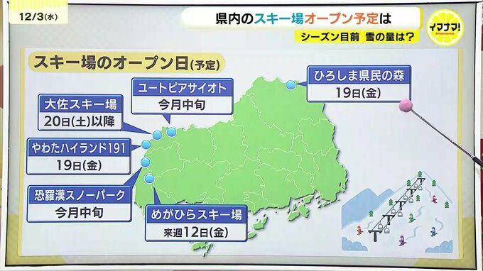 廿日市市の「めがひらスキー場」は、今月12日の金曜日。北広島町の「やわたハイランド191リゾート」は、19日。「ユートピアサイオト」は、今月中旬。天然雪のみで営業する「大佐スキー場」は、20日以降です。庄原市の「ひろしま県民の森」は、19日のオープンです。