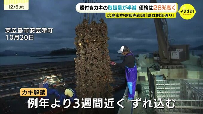 県内でカキの大量死が問題となる中、広島市の中央卸売市場で先月の「殻付きカキ」の取り扱い量が去年と比べて半減し、平均価格は約26%、値上がりしました。