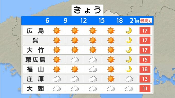最低気温は、広島市中区で6.6℃・庄原0.7℃・北広島町-1.0℃などとなっています。