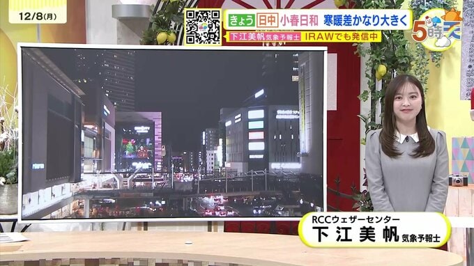 【あす12/9(火)広島天気 】おおむね晴れ 空気の乾燥に注意 12月らしい寒さに 2025年12月8日(月) 18:34 国内 天気 きょう12月8日(月)の広島県内は、沿岸部を中心に気温が上がり、小春日和となりました。一日の寒暖差がかなり大きく、またここ数日の日ごとの寒暖差もかなり大きくなっています。体調管理にはくれぐれもご注意…