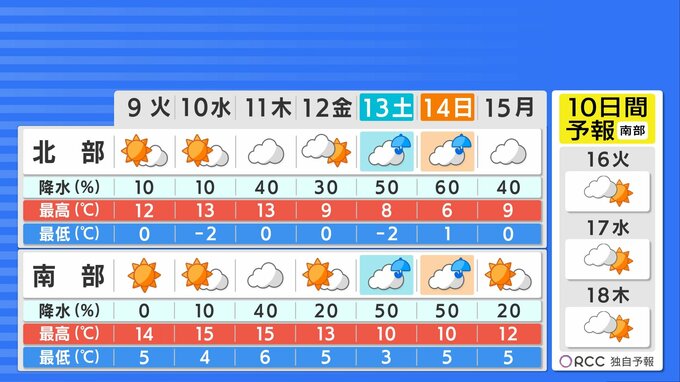 ただ、木曜日はすっきりせず、週末は前線や低気圧の影響で冷たい雨が降る見込みです。山地や標高高いところを中心に雪に変わる可能性があります。気温変化が大きいですので、体調管理にはご注意ください。