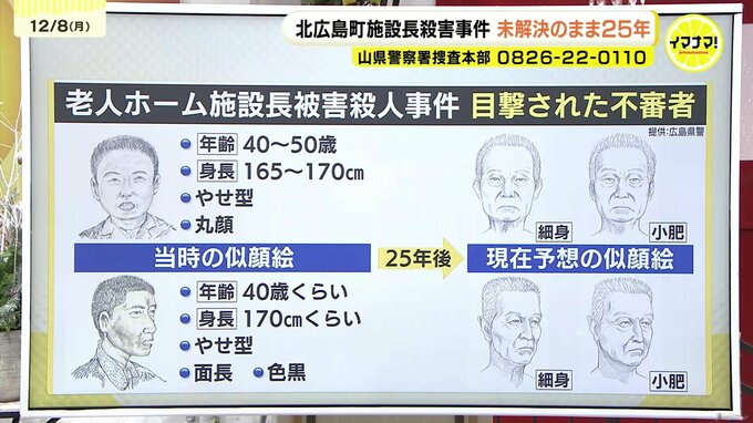 こちらが現在公開されている似顔絵です。左が発生当時、右が25年後の現在を想定し、痩せている場合と太っている場合の2パターンが作られています。科学捜査研究所と協力し、当時の似顔絵から推定しました。