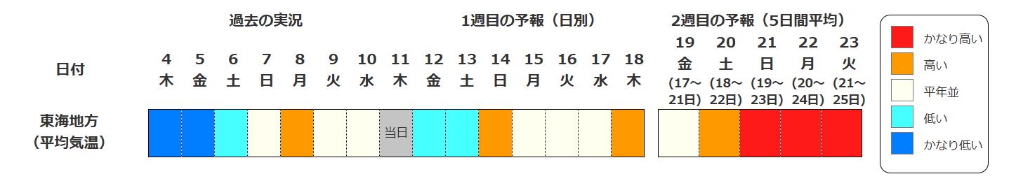 東海地方の気温は、向こう2日間程度は寒気の影響で低いですが、その後は寒気の影響を受けにくいため平年並か高く、19日頃からはかなり高くなる可能性があります。