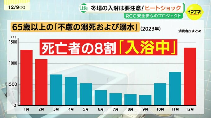 ヒートショックになりやすいのが、対応する力が低下してくる高齢者。消費者庁のまとめでは、65歳以上の水におぼれる事故は、12月がピークとなり、冬場に急増していることがわかります。また、これらの事故で「入浴中」に亡くなった人は8割にのぼります。木村医師に、ヒートショックを防ぐためのポイントを聞きました。
