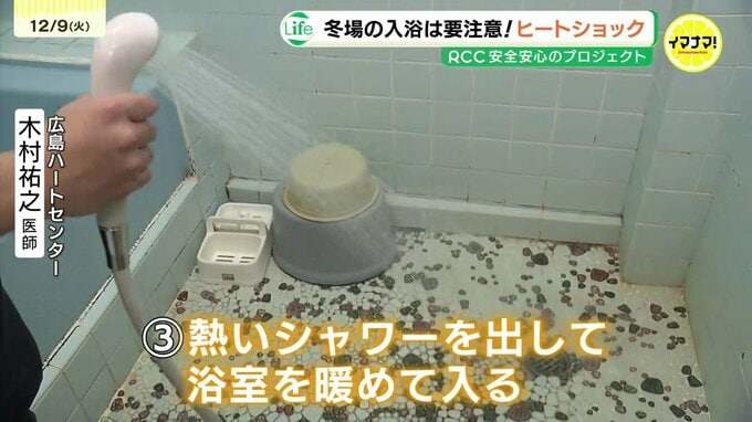 ヒートショック予防は、とにかく急激な気温差をなくすことです。お風呂の対策は▼脱衣所を暖めてから服を脱ぐ▼熱いシャワーを出して浴室を暖めてから入る▼高齢の方は半身浴に、がポイントです。なお、ヒートショックはお風呂以外でも起こってしまいます。例えば、夜中にトイレに行くときは何かを羽織るなども予防になります。さらに、若者も注意が必要です。飲酒後すぐの入浴、ストレス・喫煙がある人は、ヒートショックになりやすくなります。急激な気温差をなくす行動を心がけてください。