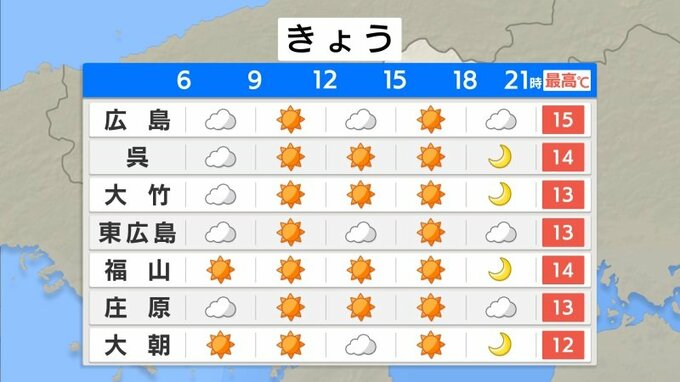 きょうはこの後、日差しが届けば暖かさも感じられるでしょう。最高気温は広島15℃、呉・福山14℃、庄原13℃の予想です。空気が乾燥していますので、火の取り扱いにご注意ください。あす11日は雨が降る見込みです。きょうの日差しを有効に利用してください。