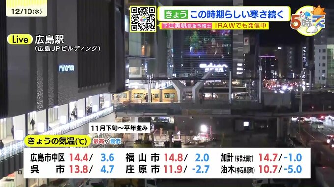 きょう12月9日(火)の広島県内は、朝は雲が多い時間もありましたが、午後はよく晴れました。最高気温は、広島市中区で14.4℃ 福山14.8℃など、各地11月下旬~平年並となっています。