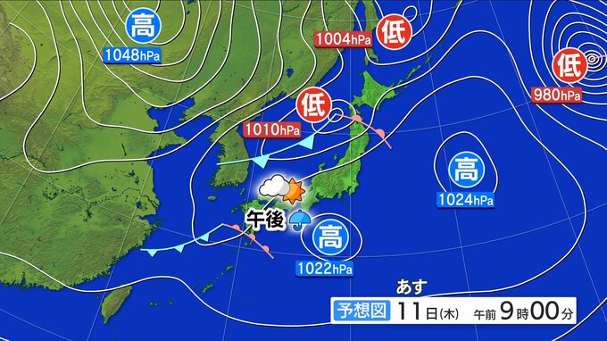 11日(木)午前中は日差しも 午後は一時的に雨 朝は傘を忘れずに